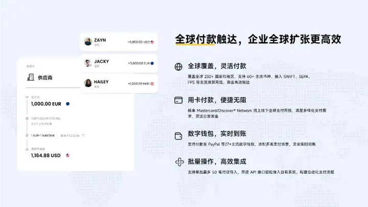 针对不同行业、不同规模企业在出海欧洲经常面临的物流仓储、广告投放、VAT缴税、发薪等付款需求,PhotonPay光子易提供卡支付、付款至PayPal电子钱包、批量付款等多种本地和全球付款选择,助力企业轻松向欧洲乃至全球供应商和员工付款,业务快人一步。