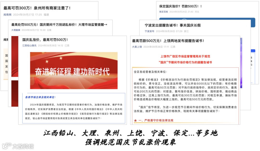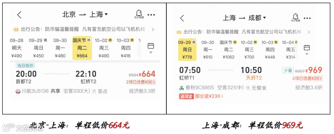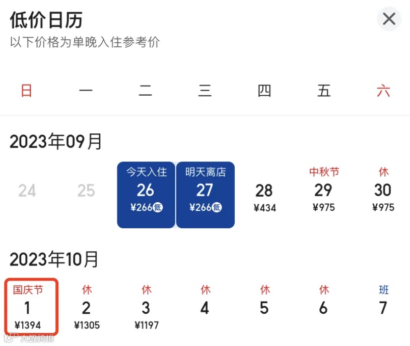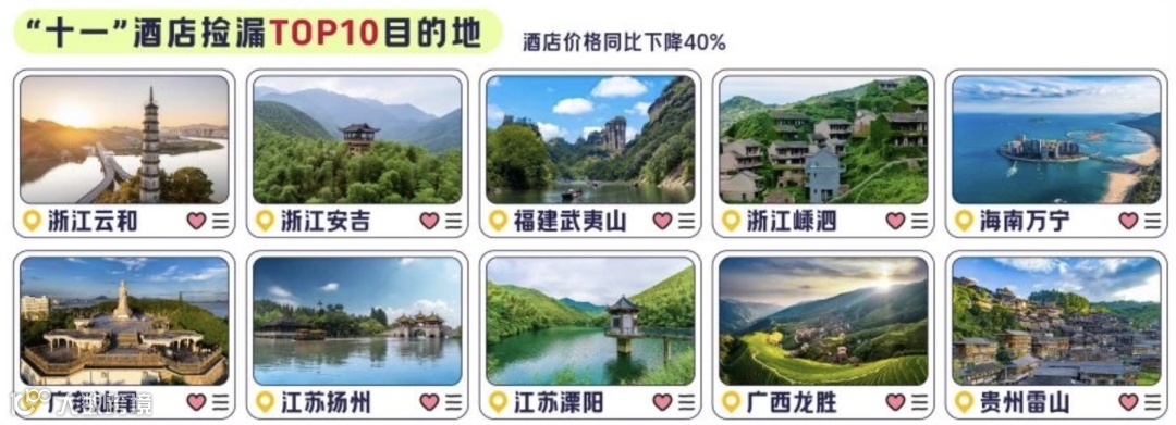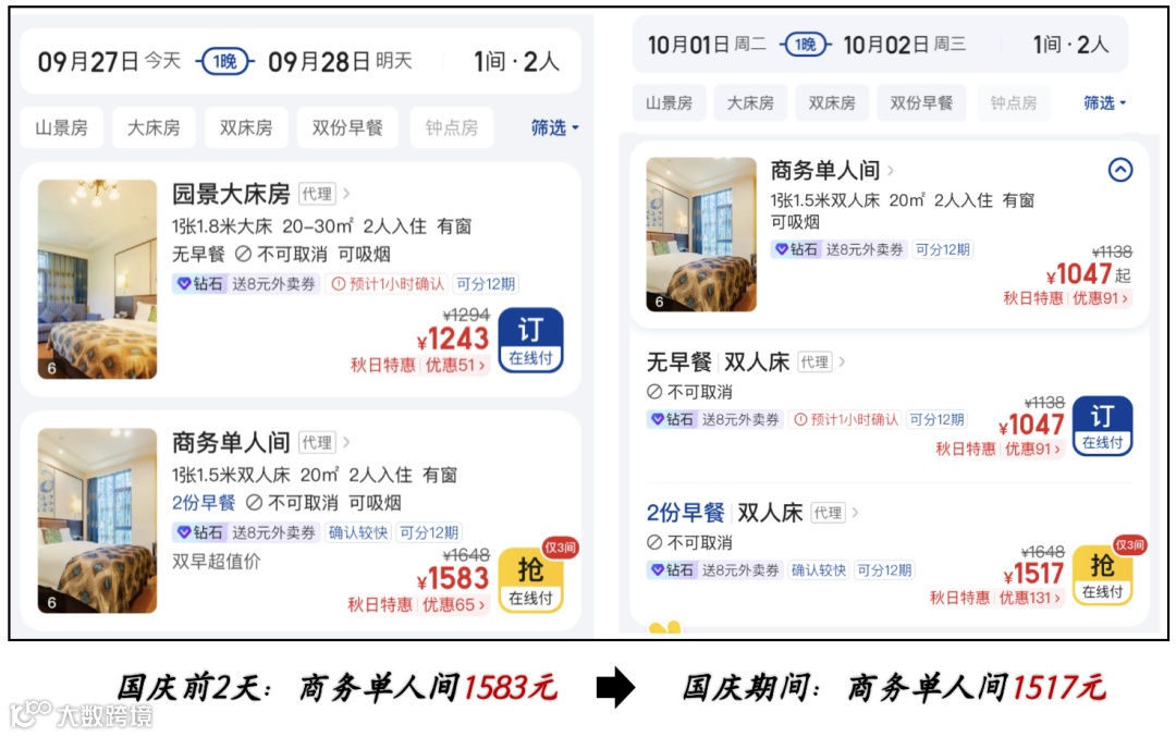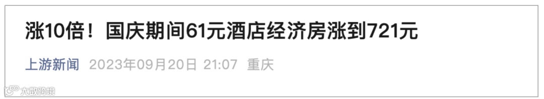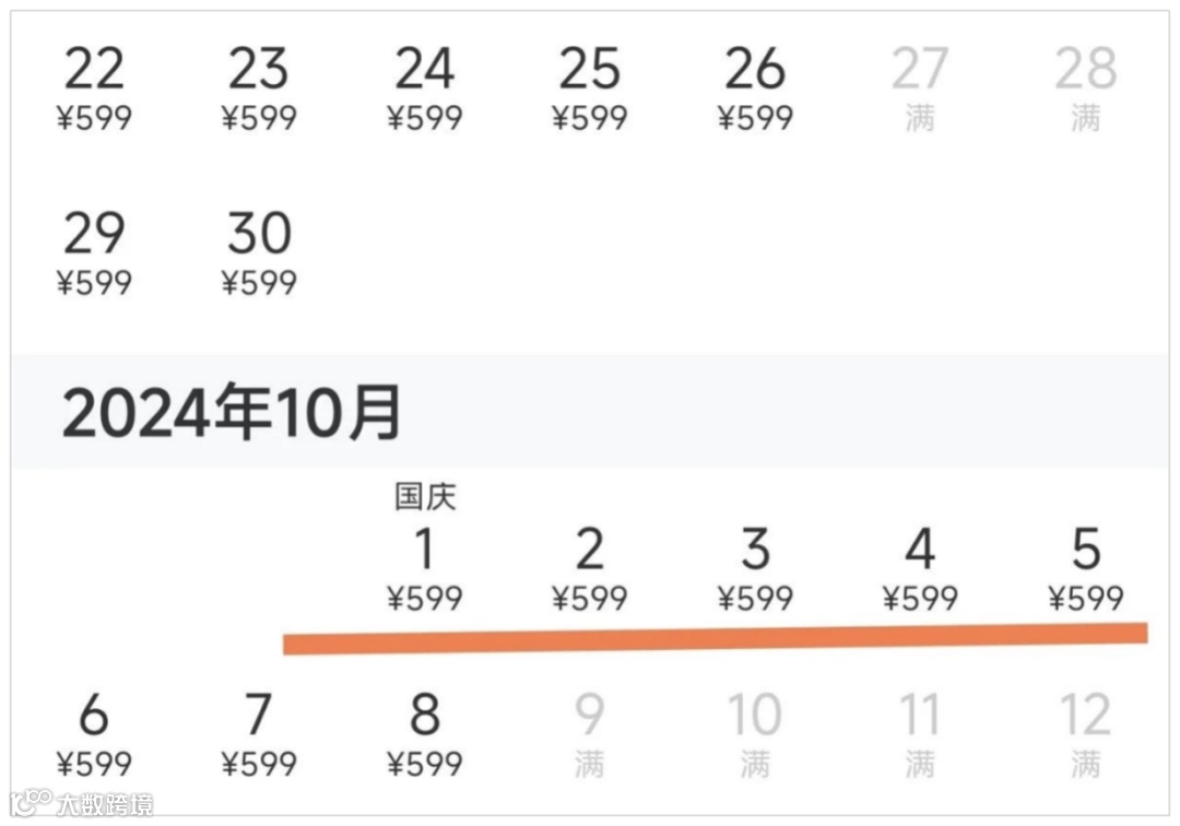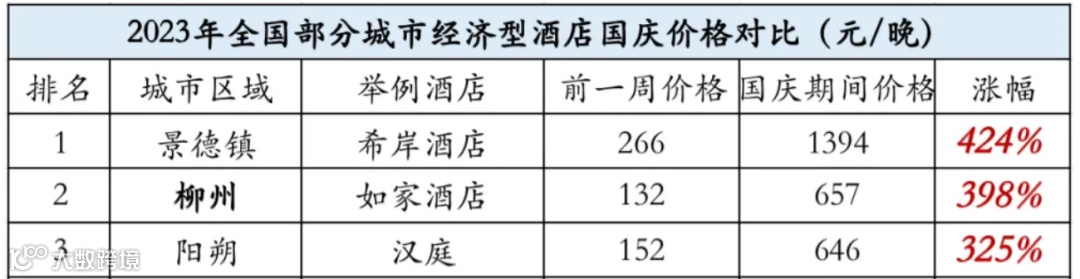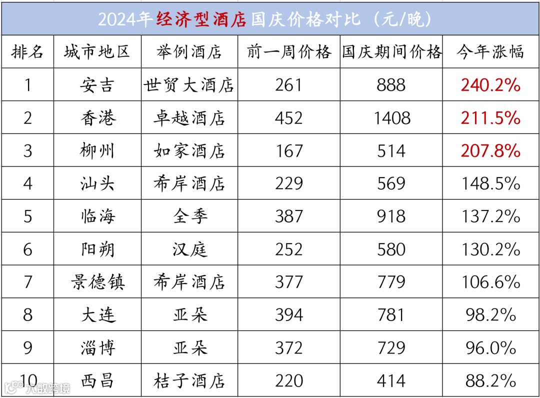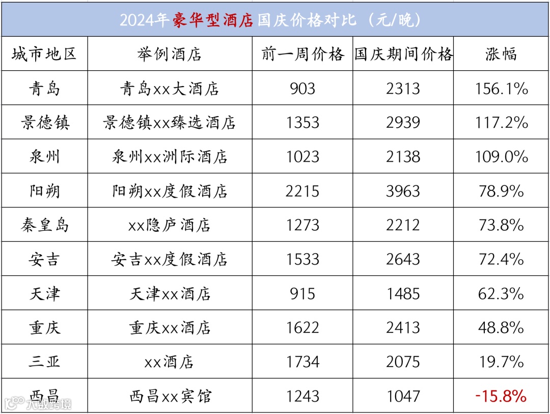 而真要说对于以往国庆最记忆犹新,还是那些年一起被机票、酒店涨价背刺过的日子了。 去年十一长假,多少提前买了飞机票的朋友都悔清了肠子,又有多少人哭晕在逆天涨价的酒店前。 而就当我以为今年大概率也是如此,没想到这次国庆猛得一个画风突变。根据飞猪发布的《2024国庆假期出游风向标》显示,今年国庆假期国内外酒店均价同比下降约4.5%。 就连以往高高在上奢侈酒店们,也暗搓搓在自己房价后面加上了一个小括弧,表示“国庆不加价”。 来源:网易文旅 更夸张的还是机票,简直就是清仓大甩卖:特价广州飞北海300元、上海飞厦门500元。 根据携程发布的《2024年国庆旅游预测报告》,“十一”国内和出境机票价格较去年同期下降超过20%。 我搜了下,即使是正值节假日的机票,国庆北京到上海的单程大概在664,甚至长假开始的前两天更低400多,要知道这可是人流最旺盛的时候。 哪怕更远点的,上海去成都的票价也不到1000块。 这样的价格别说是国庆这样的超级假期,就是放在平时也是绝对的少见。今年的国庆,怎么说变就变了。 说实话,直到现在我还记得去年国庆节的酒店,应该是闭着眼睛订的。 试问看见这样从原来几百块猛跳到1000元以上,谁能不眼前一黑? 包括去年我们也曾统计过小伙伴们出行必备的经济型酒店,25个城市里中涨幅超过100%的经济型酒店占比在8成以上,其中排名第一的酒店涨幅能高达424%。 但是今年可不一样。去年的酒店赚得有多开心,今年就有多哭唧唧。 这里特意挑出去年涨幅排名TOP10的作为对比,可以看到类似如家、汉庭这样的经济型酒店,对比去年前10的涨幅在230%-420%之间,而今年涨也在涨,但明显比去年差了口气。 即使是排名第一安吉的世贸大酒店,从国庆前的261元/晚跳涨到国庆期间的888元/晚,够夸张了吧,但240.2%的涨幅,都得排在去年10名开外的位置。 这还是名列前茅的种子选手,比如下面这家599元价位某家酒店可预约日期,国庆节的价格已经和正常9月的价格一模一样。 不敢涨,一分都不敢涨。 而你以为只有经济型酒店本分起来不怎么涨价了么?我告诉你,豪华酒店们今年的态度只能说,更是前所未见。 还记得去年国庆就看过三亚某酒店,平时最低房价也就2688元/晚,国庆直接涨到8388元/晚。确实开了眼了。而如今当真是风水轮流转,以往高不可攀的高级酒店们,今年就差现场给游客们跪一个助兴了。 不仅最高涨幅也就156%,比经济型酒店还低。各位注意到表格的最后方了么,是的,这年头居然豪华酒店还有在国庆节自降身价的。 以西昌某豪华酒店为例,国庆前两天商务单人间的价格还是1583元/晚,到了最抢手的国庆就变成1517元/晚,足足便宜了66元。甚至还推出了1047元/晚的无早餐版。 再比如三亚这家酒店,已经开始拼额外服务了,连订三晚送机场接送机+豪华邮轮一日游代金券+水上娱乐代金券,一价全包。 看到这里,我不禁想,什么叫曾经的我你爱答不理,现在的我你高攀不起。这就是了。 而据携程显示,浙江云和、浙江安吉、福建武夷山、浙江嵊泗、海南万宁、广东汕尾、江苏扬州、江苏溧阳、广西龙胜、贵州雷山的酒店,均价同比下降40%,成为最值得“酒店捡漏”的TOP 10目的地,不知道今年有没有幸运鹅们捡漏成功。 来源:携程 但这其实是好事,因为如果这些酒店们提前看了今年的旅行报告就该知道。 以往大家国庆去哪? 哪里人多去哪里,去爬最挤的长城,去抢最早班的景区门票,属于是凌晨珠穆朗玛峰都给堵成停车场那种。 而今年从数据上看,国庆出行依旧火热。 今年,铁路国庆假期运输将从9月29日开始,至10月8日结束,为期10天,全国预计发送旅客1.75亿人次。 根据铁路大数据分析,10月1日将成为出行客流高峰日,预计将突破2100万人次。 这是朋友9月29号凌晨五点半给我拍的虹桥火车站:每个人都巴不得坐上最早班的火车。 9月28日实拍,来源:@吾言宁波 肉眼可见也是,人人人人... 而真正改变的,其实是来自细分旅游人群决策的变化。 第一种最明显的,大城青年和小镇青年开始角色反转了。 也就是说,当小镇青年们还在借着国庆憧憬大城市不眠的霓虹灯,反观平日里表面光鲜的大城青年们,只想在这7天里,成为山野乡间一只上跳下窜的吗喽。 据统计,一二线城市旅客来到县城休闲游和回乡省亲,带动乡村游订单增长超60%,县域游订单同比增长20% 所以这个国庆你可能在哪些地方发现这些大城青年们? 不是国际都市里的都市丽人,可能是阿勒泰的一望无际的草原,可能是威海碧蓝的天空与浪花。 更细分的网瘾少年们,也会因为《黑神话:悟空》玩得太投入,去到山西的大同、朔州、临汾等目的地,订单同比增长超30%。 连带着今年还火了一种更小众的旅游点:以往大家都是去看艺术展看演唱会,今年流行去山里看“石头”。 来源:网络 石窟也越来越火了。预计今年国庆的洛阳市龙门石窟、大同市云冈石窟、酒泉市莫高窟景区、衢州市龙游石窟等自驾热度持续升高。 而如果说阿勒泰、龙门石窟、还有《黑神话:悟空》带火的山西,成年人国庆去哪玩还要做选择题。 那么各位,注意前方高能。 今年国庆出行还有一类人异军突起了:国庆去哪,小孩哥小孩姐说了算。 来源:小红书 报告数据显示,“十一”亲子游占比超三成,研学游产品订单上涨超四成:“985学霸带你游复旦,赏万国建筑”、“儿子同学说,十一要去北京中科院参加夏令营”…… 