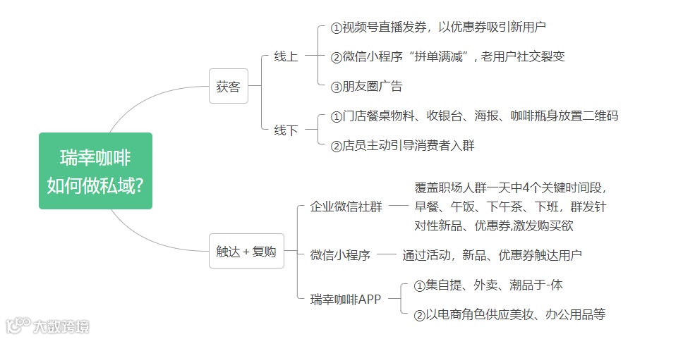 瑞幸没有放过任何获客的机会,在线上,视频号直播发放优惠券,朋友圈发布广告,将公域用户吸引过来,变成私域用户,然后再用微信小程序拼单满减,让老用户带动新用户,既形成了裂变拉新,也促使了成交。