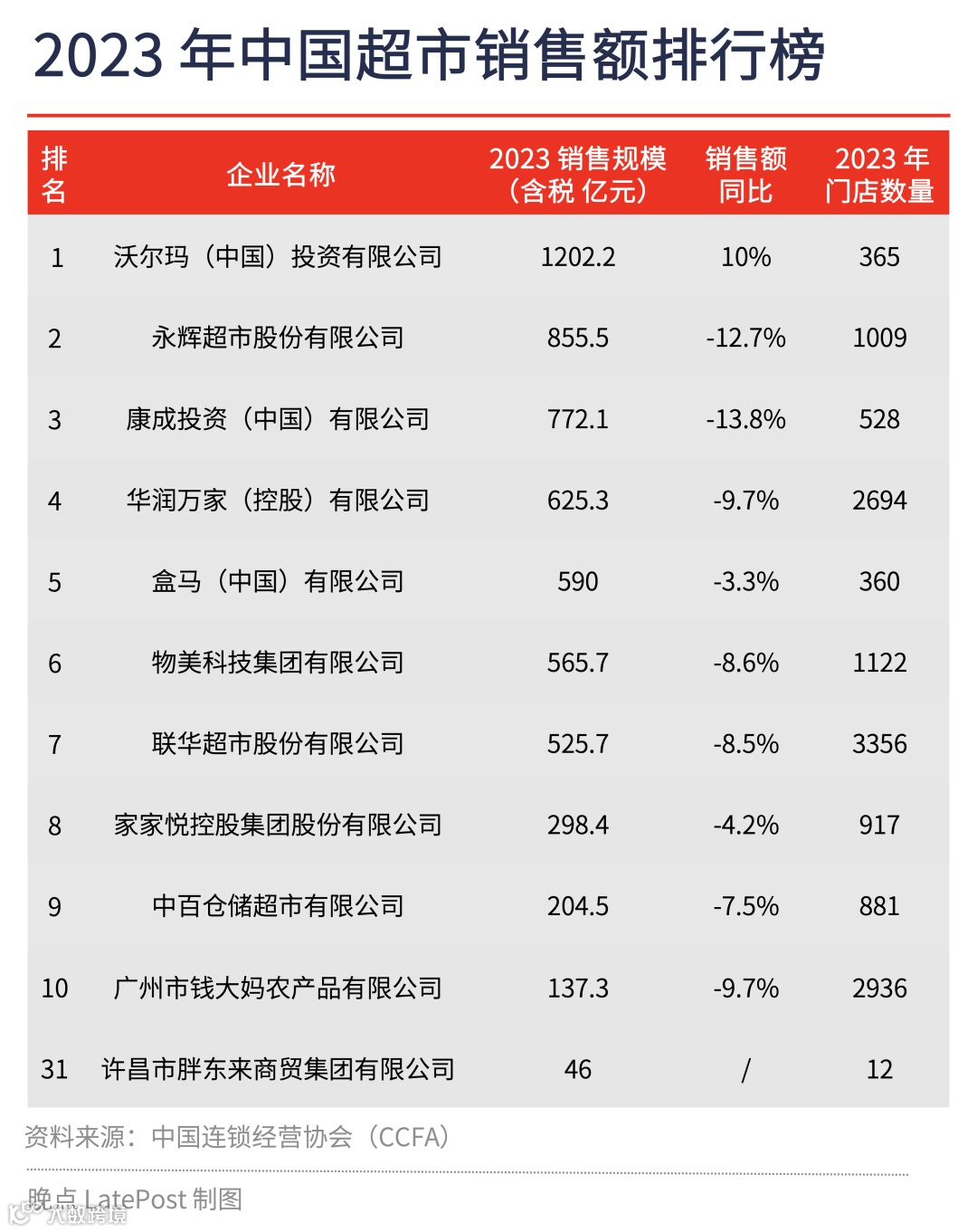 2023 年,永辉全年的销售额达到 855.5 亿元,全国有 1000 家门店,连续三年位居中国超市业态第二名,2020 年永辉曾跃居至中国超市销售额的第一名。