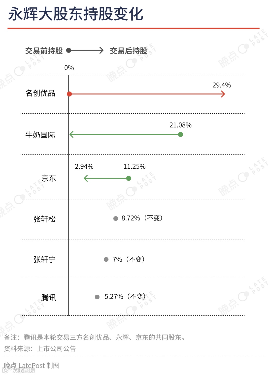 名创入场的价格远低于永辉目前的外部大股东。京东在 2015 年、腾讯在 2017 年投资的价格分别是名创的两倍和四倍。