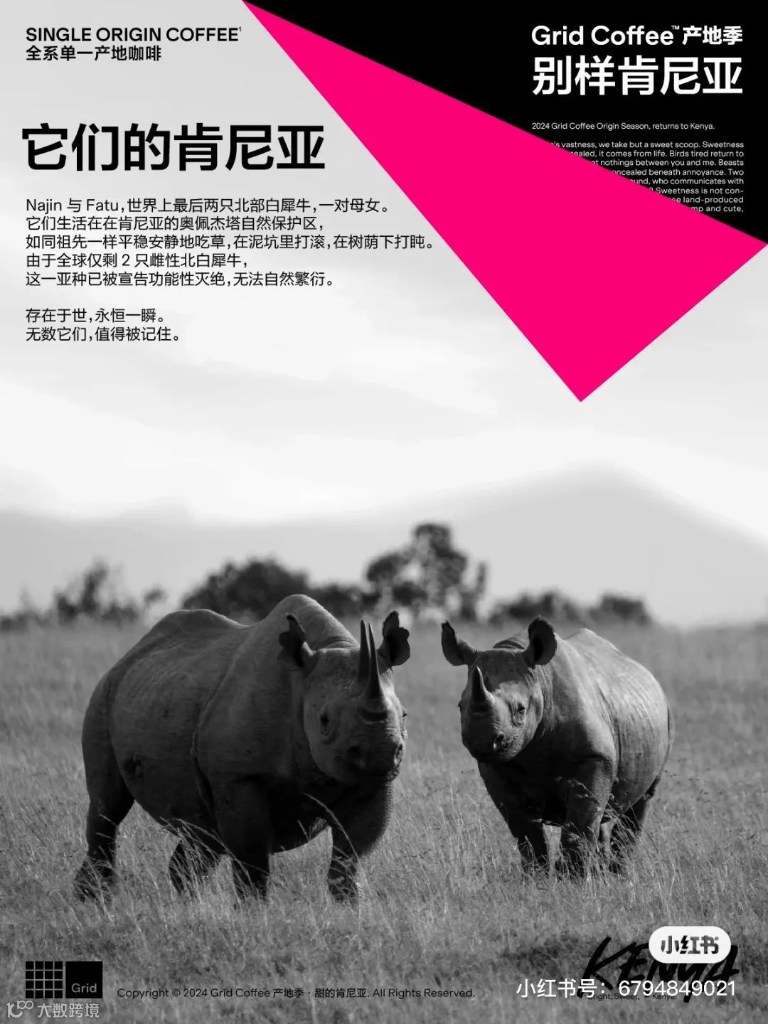 Grid Coffee 把叙事落脚点放到了肯尼亚自然保护区里的一对北部白犀牛身上。这对北部白犀牛母女,是世界上最后两只北部白犀牛。她们死后,这个物种会灭绝。这本是个哀伤的故事,但当我们看到她们相互依偎时,我们却能感受到一股忧伤的甜蜜。