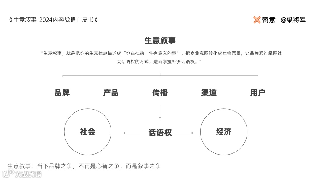 “所谓生意叙事,就是把你的生意信息,描述成‘你在推动一件有意义的事’。把商业意图转化成社会愿景,让品牌通过掌握社会话语权的方式,进而掌握经济话语权。”