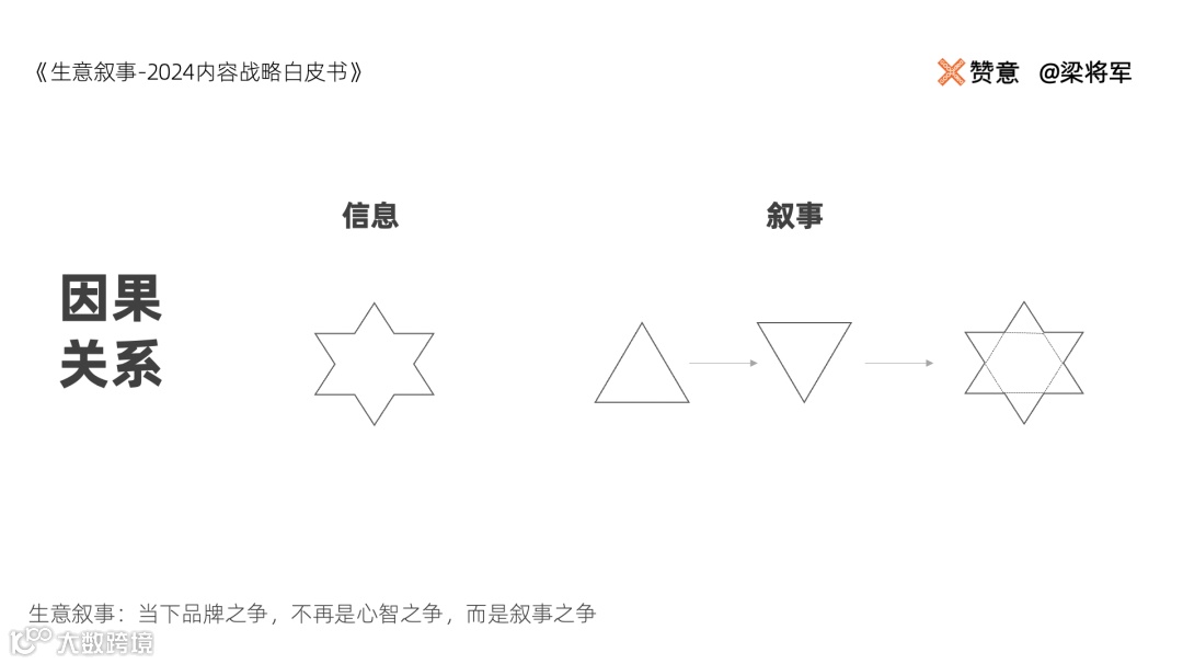 而靠叙事来影响消费者,就像图里右侧这三个图形的诞生过程。你能清晰地看出这颗六芒星是如何一步步变化出来的,这些信息组合与变化,构成了一种因果关系。