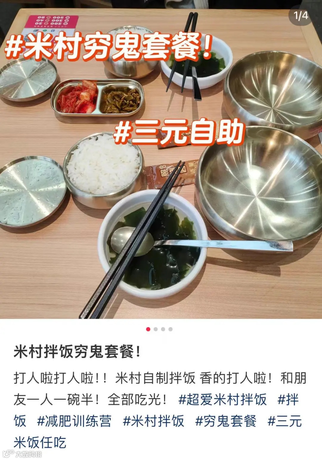 但真正让它一传十十传百走红的,是年轻人开发出的穷鬼套餐:只要花三块钱,就可以买到一碗五常大米、海带汤以及免费小菜,还能无限续。