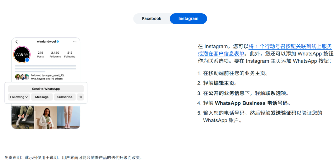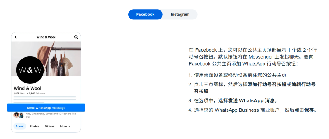 在 Facebook 公共主页或 Instagram 上添加 “通过 WhatsApp 联系我们” 按钮,引导客户进入聊天。