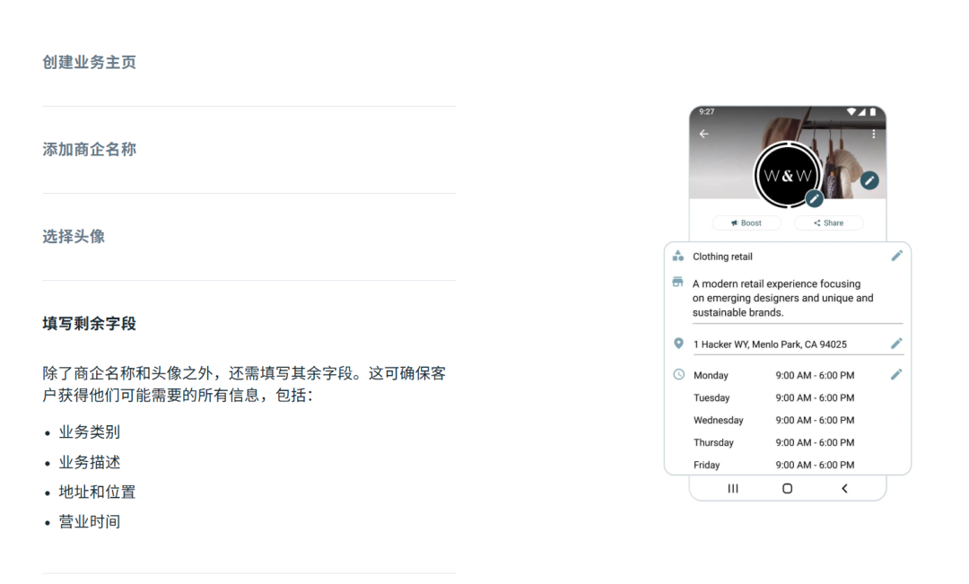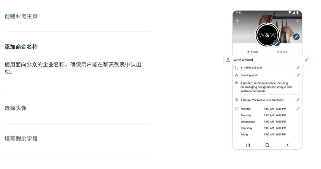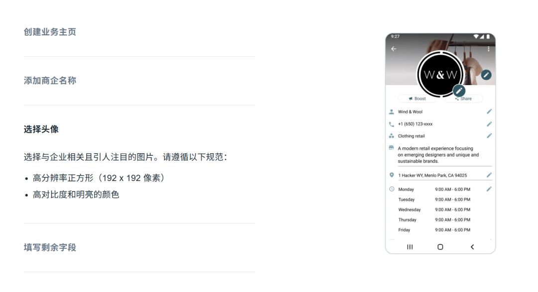业务主页:添加头像、描述、电话、位置,树立品牌形象。
