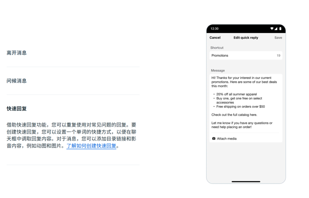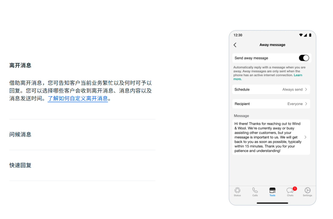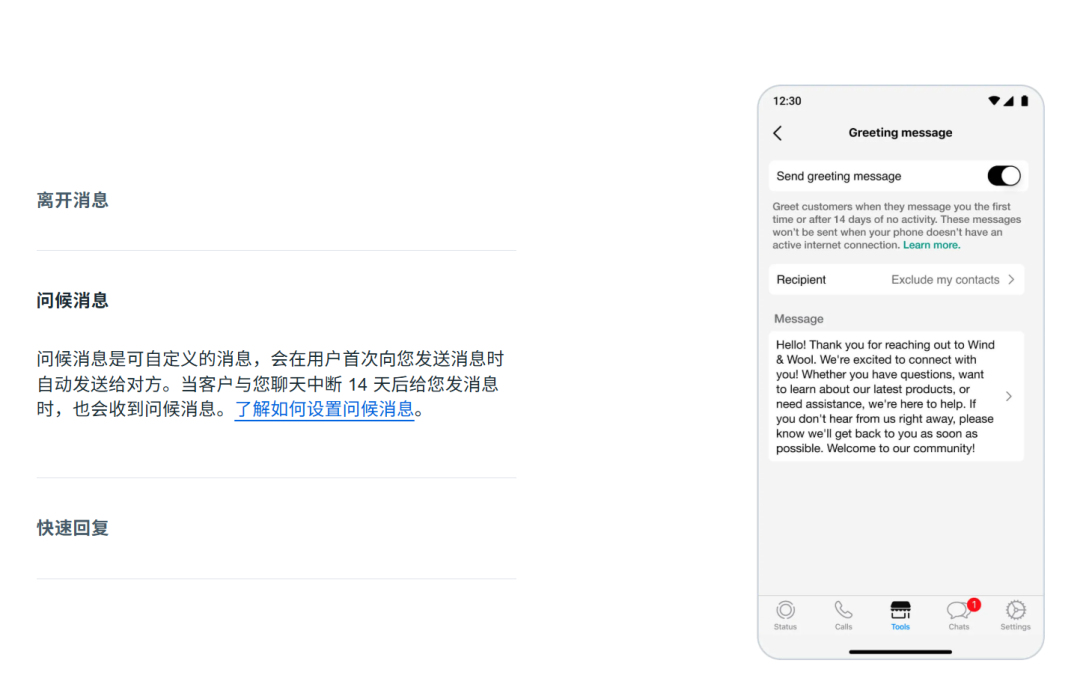 自动回复消息:离开时自动回复,首次互动自动问候。