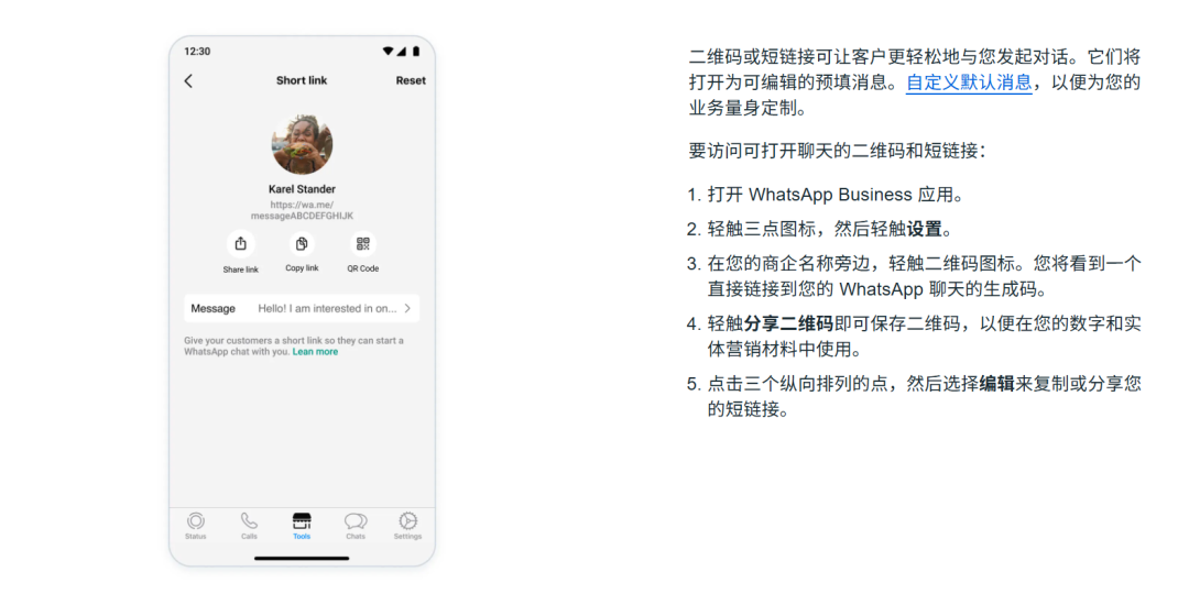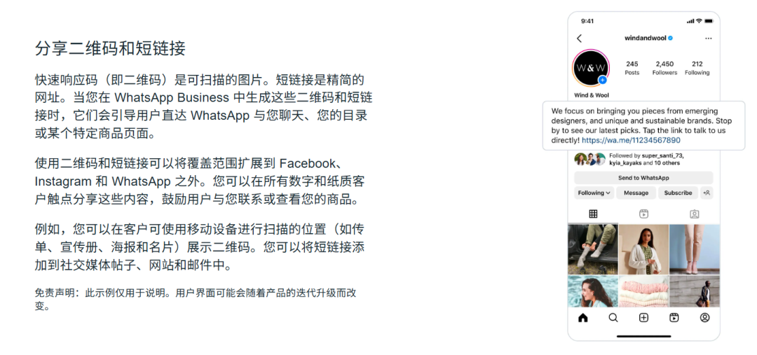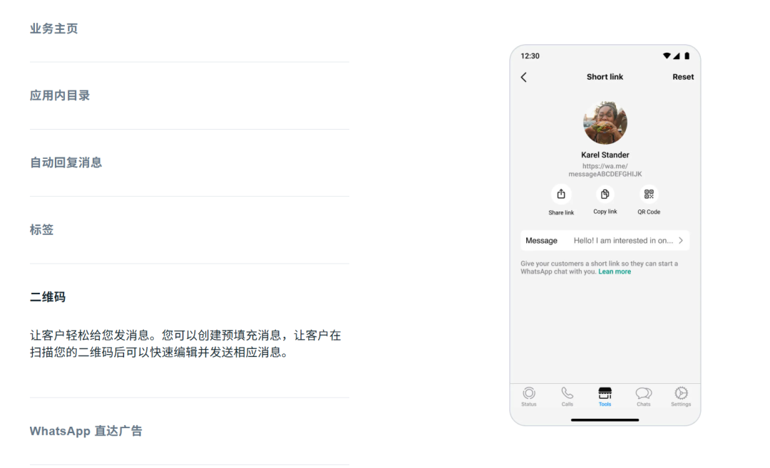 二维码和短链接能让客户一键直达聊天、目录或商品。可放置于: