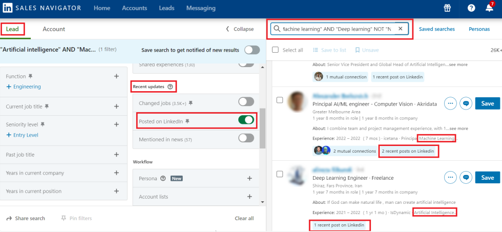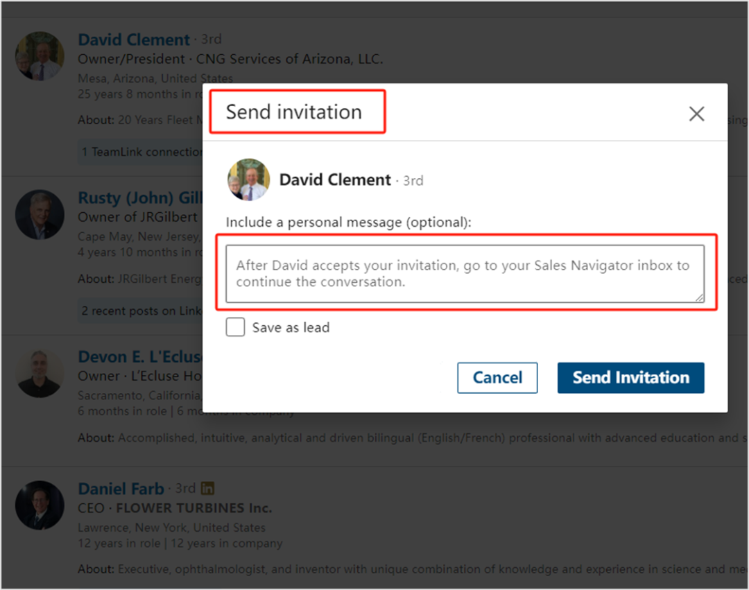 这样你就可以自定义搜索,找到具有特定属性的潜在客户。和基础的领英搜索不同,Sales Navigator用户可以进行无限次搜索,让你能像使用高精度GPS一样,轻松找到你理想中的客户,无论他们的公司规模、职位、工作年限,甚至是他们所属的部门。