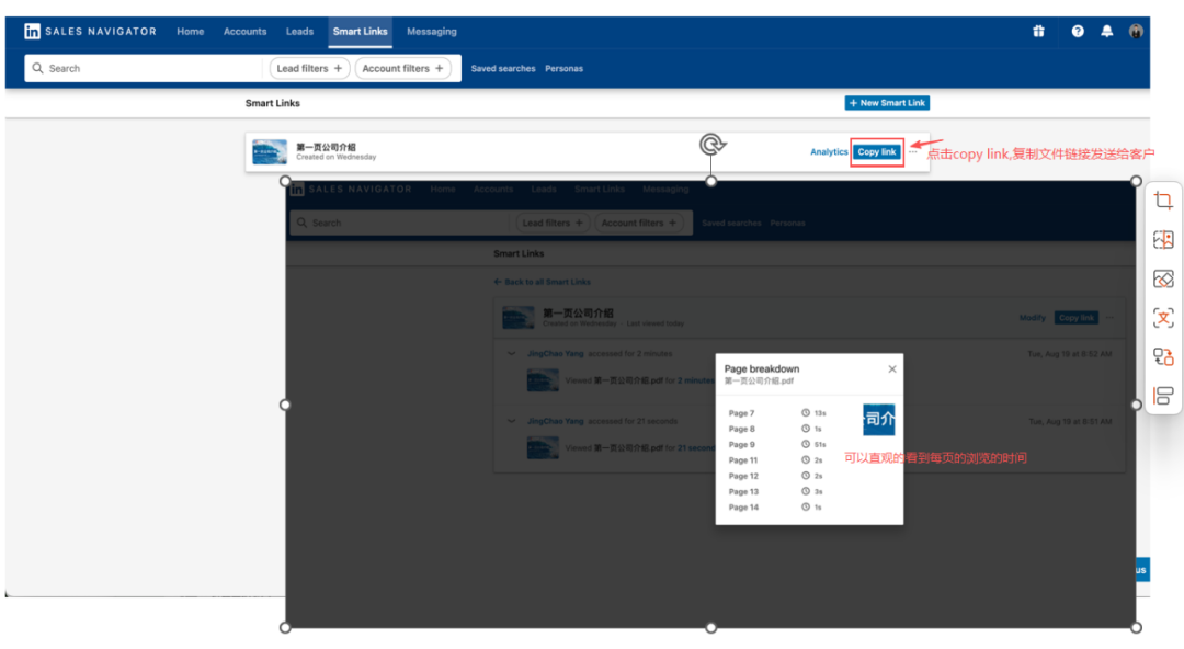 点击copy link,复制文件链接发送到客户面前,可直观看到产品文件每页浏览时间,判断出客户兴趣度,进行下一步客户开发。