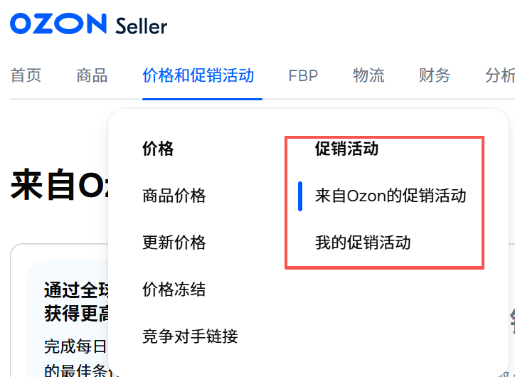 关于ozon平台的活动这里分为两个部分(如图)