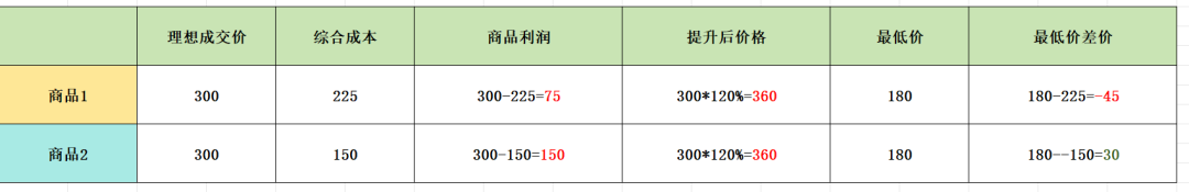 假设说我们这两件商品想要参加促销活动,那么首先是不是需要先将我们的价格提高,假设说我们是按照比例来提高,比如说我把价格提高20%,那我们会发现商品1和商品2涨完价之后都是360(300*120%)