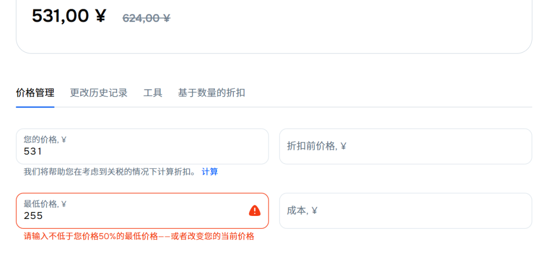我们来到一件商品的价格设置界面,我们可以看到商品的原价定的是531RMB,我们如果给他定255RMB,我们会发现他这边弹出了提示商品的最低价格不能低于原价的50%的提示。