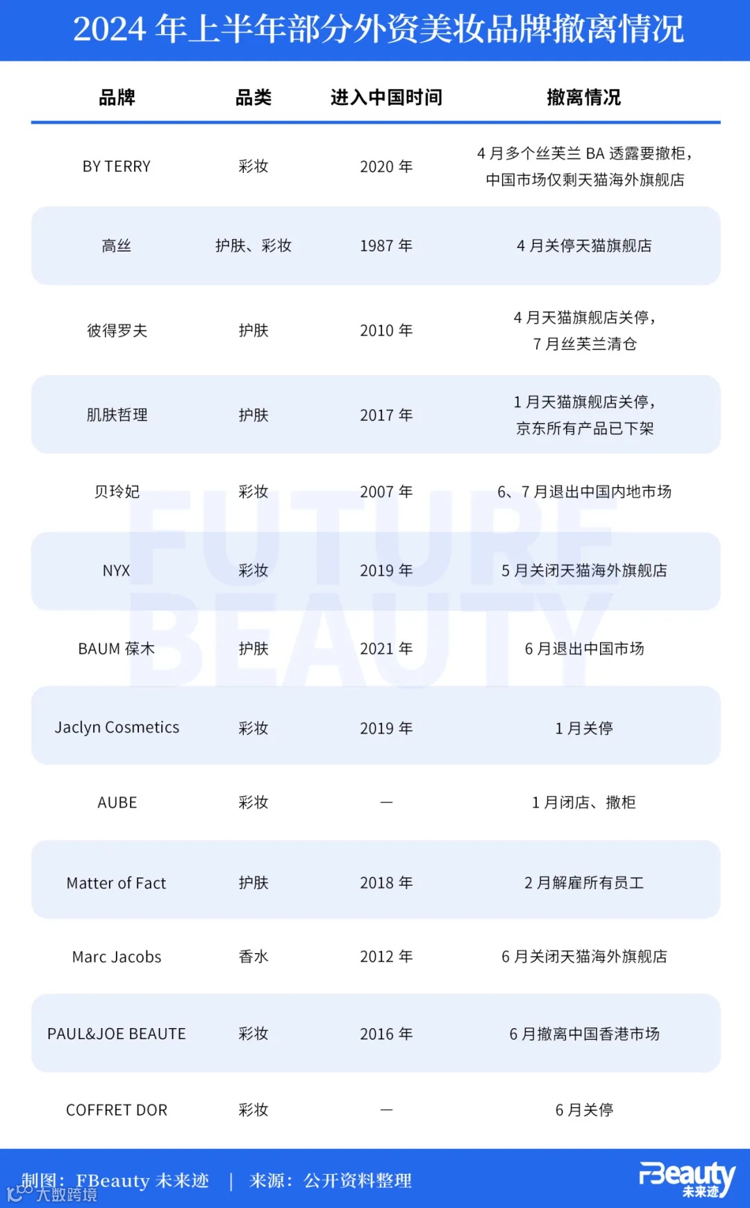 于是我又去看今年上半年外资美妆品牌在中国市场的撤离情况,还真不比国货品牌的情况乐观,关键里面还有许多背靠头部国际集团的品牌,比如资生堂的BAUM葆木、科蒂的肌肤哲理和Marc Jacobs、欧莱雅的NYX、LVMH的贝玲妃等等。