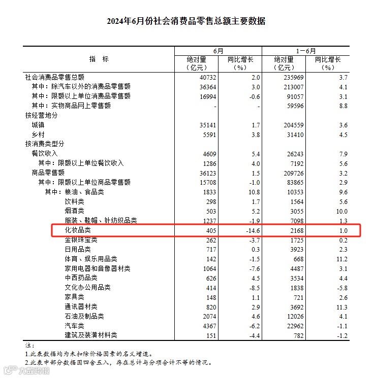 7月15日那天,一张数据截图在朋友圈刷屏,是国家统计局发布的今年上半年社会消费品零售总额数据,上面显示,化妆品类在今年6月同比下降了14.6%,整个上半年仅上升1%。