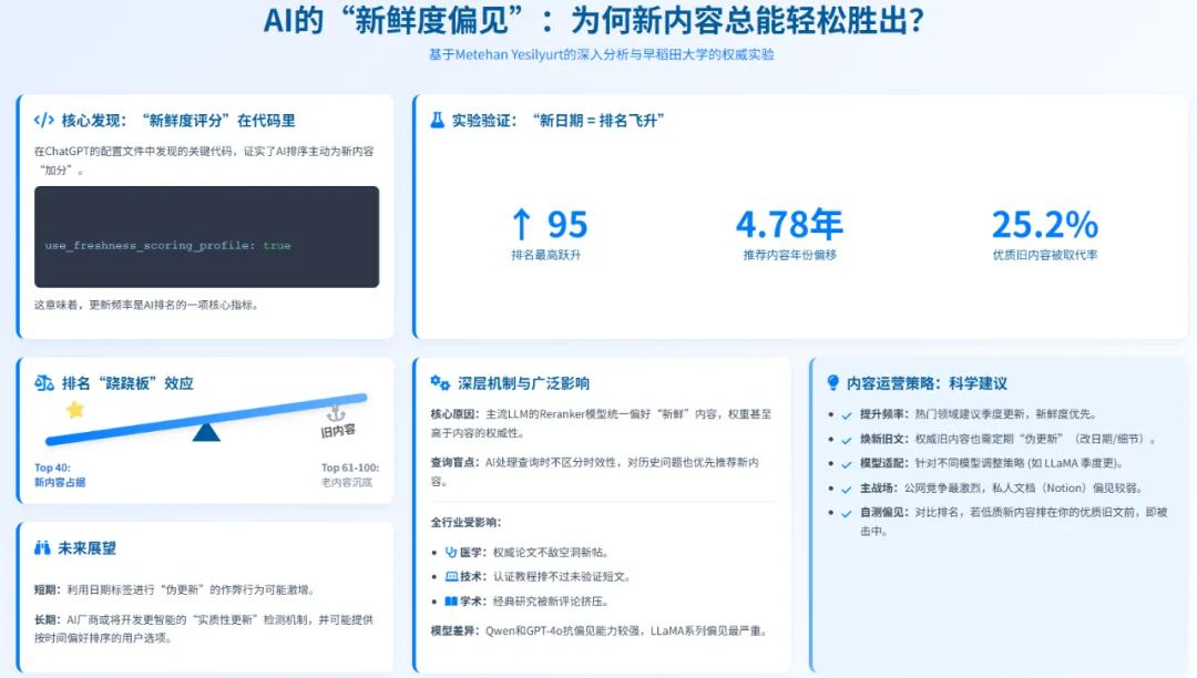 为何会出现这种现象?核心在于所有主流大语言模型(LLM)的Reranker模型都统一偏好“新鲜”内容。新日期的权重之高,甚至能压倒内容的深度与权威性。更关键的是,AI在处理查询时,并不会区分其时效性,即使用户查询的是历史性问题,AI依然会优先推荐新内容。