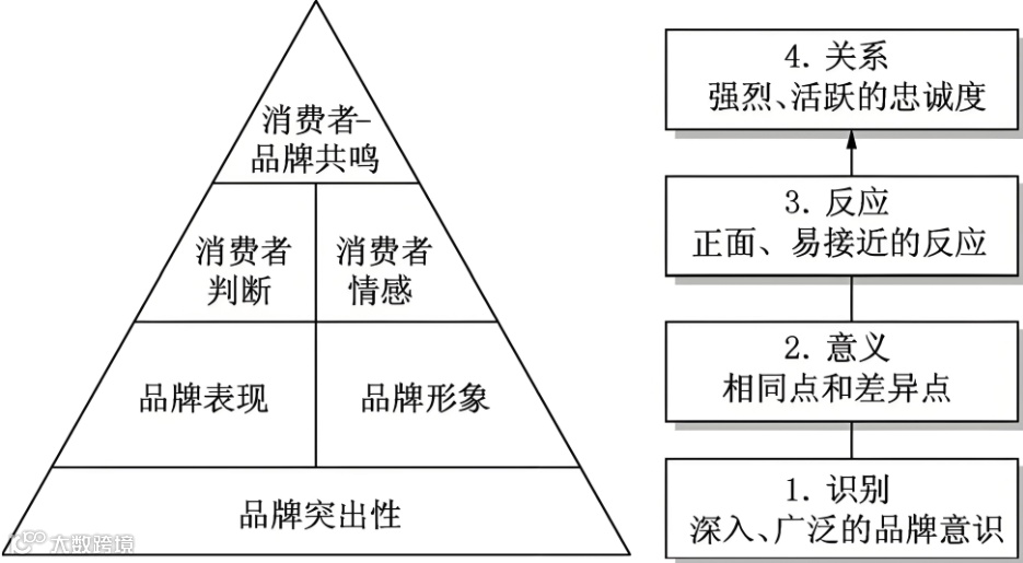 整个模型是一个金字塔结构的呈现,说明了建立强大的品牌资产需要遵循的四个步骤:品牌标识、品牌内涵、品牌反应、品牌关系。