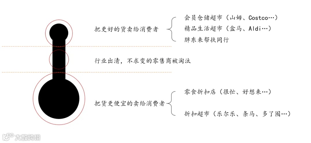 2)顺应质价比需求,零售商总要两者占一头优势,要么把更好的货卖给消费者,要么把货更便宜卖给消费者,这就有了零售企业发展的两条路径,服务不同消费群体,夹在中间的传统零售企业逐步出清;