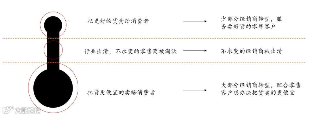3)零售商顺应消费者变化发生变化,连锁反应影响经销商,好的货未必需要经销商,把货卖便宜挤压经销商的生意空间,求变找准新的生意定位,有机会逆势增长,否则就容易被出清;
