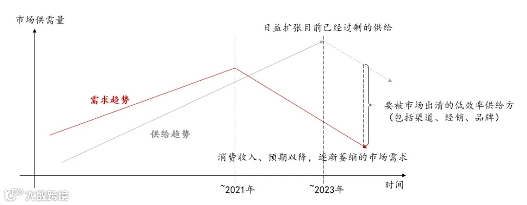1)缩量时代,消费者收入/预期双降,导致消费需求萎缩,加速市场供需关系发生颠覆性变化,且消费者从消费升级转向更追求质价比;