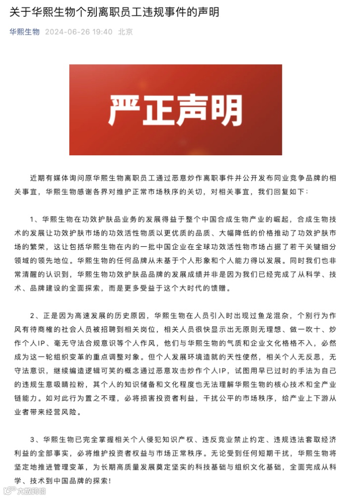 6月26日晚,华熙生物官方公众号发布《关于华熙生物个别离职员工违规事件的声明》,尽管没有指名道姓,但业界普遍认为这是对前员工枝繁繁接连通过社交媒体指控华熙生物“职场霸凌”的正式回应。