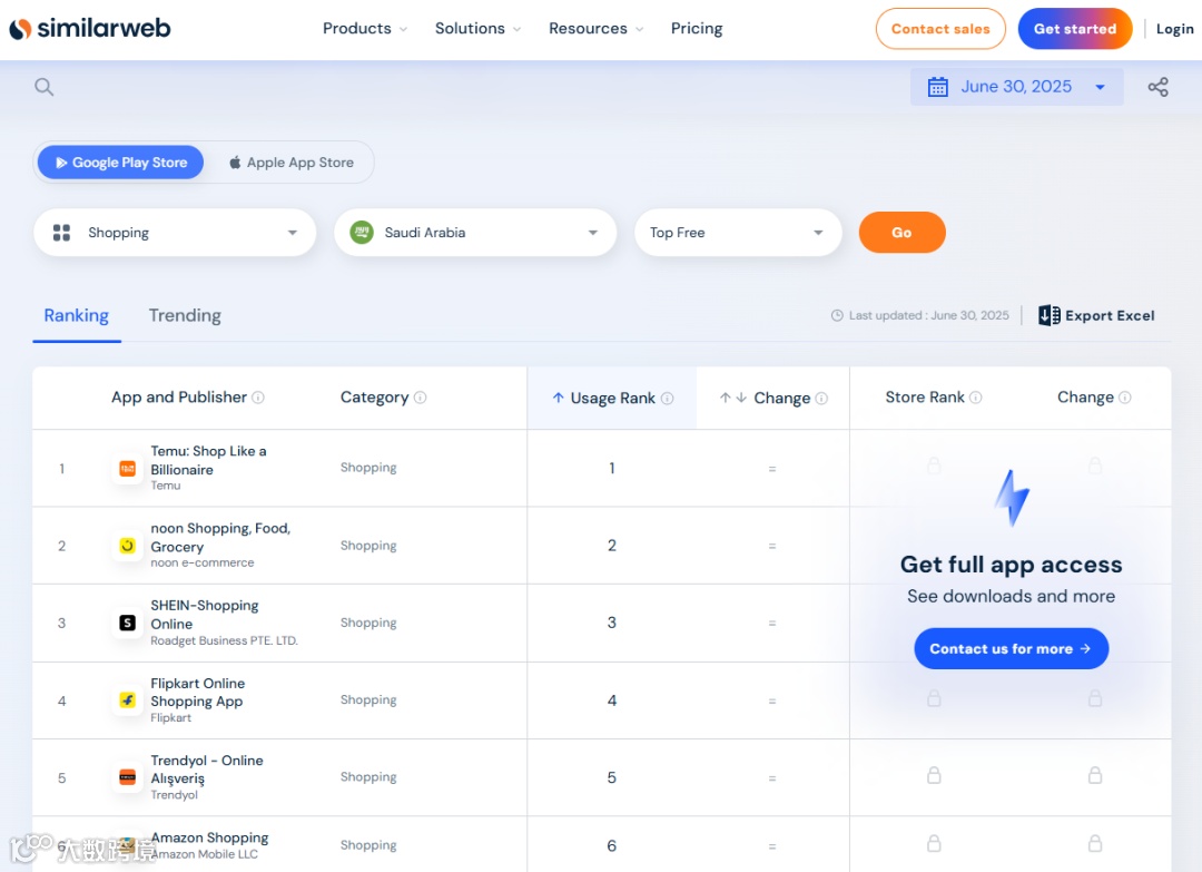 据悉,SHEIN、Temu已占据沙特30%线上市场份额。另据Similarweb显示,截止2025年6月30日,Temu和SHEIN在Google Play Store的使用排名位列第一和第三。