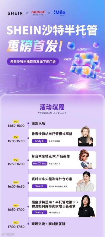 如果您对SHEIN中东站感兴趣,7月9日下午15:00至17:00,我们将联合SHEIN、iMile在深圳开展 SHEIN沙特站半托管首发线下闭门会 ,期待你的参与!
