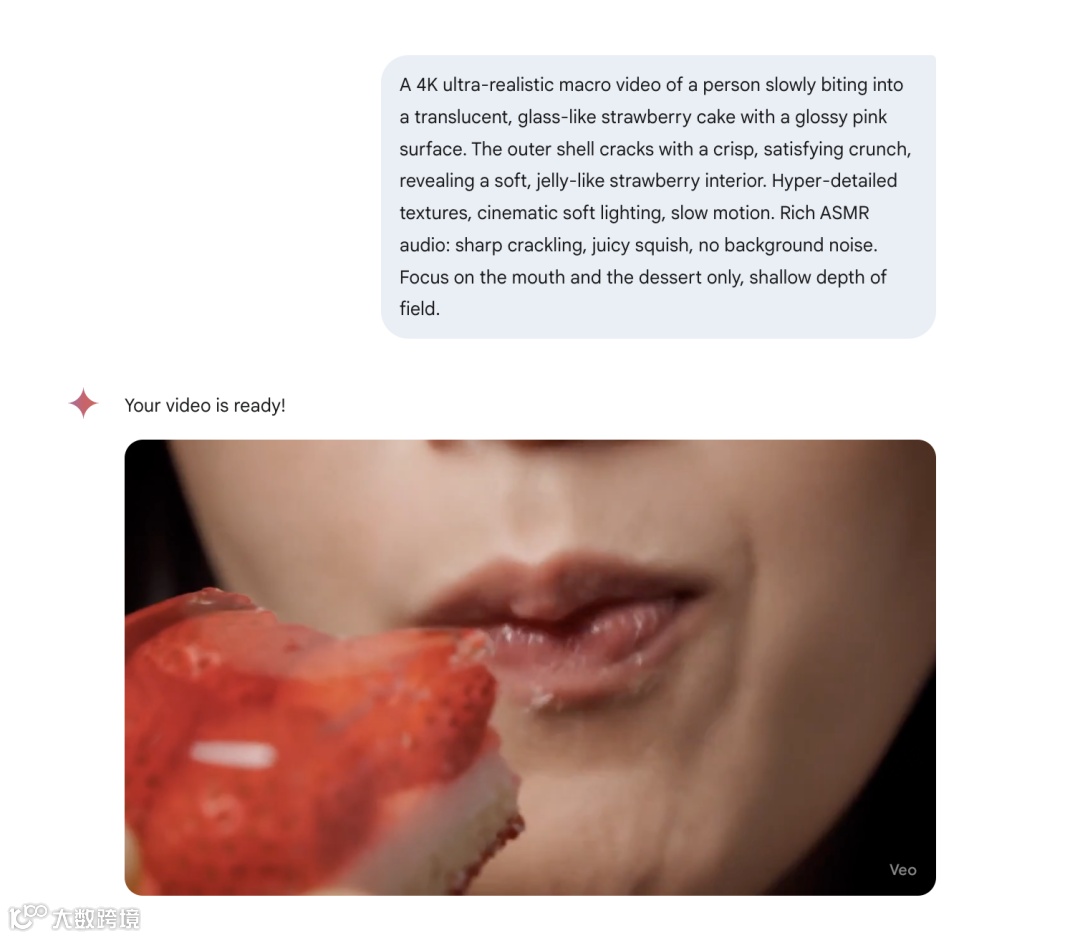 你需要的不是普通的“吃草莓蛋糕”,而是要咬下去发出「咔哧」声,具备「玻璃碎裂感」和「果酱爆浆感」,并提供视觉与听觉的双重享受。可直接复制以下话给ChatGPT: