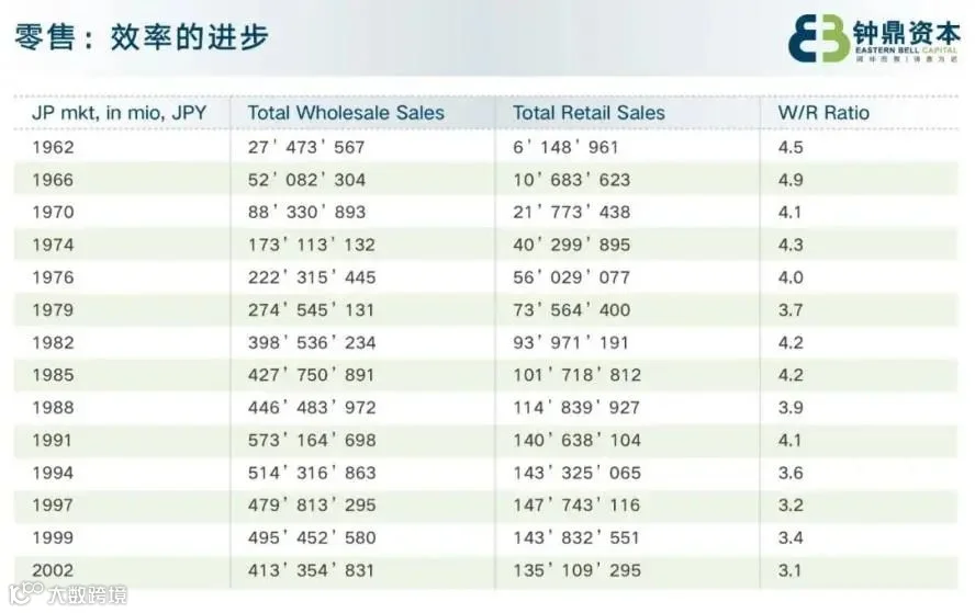 钟鼎资本曾通过梳理日本1962-2002年的批发、零售数据,验证了零售业态演化背后的效率持续提升。