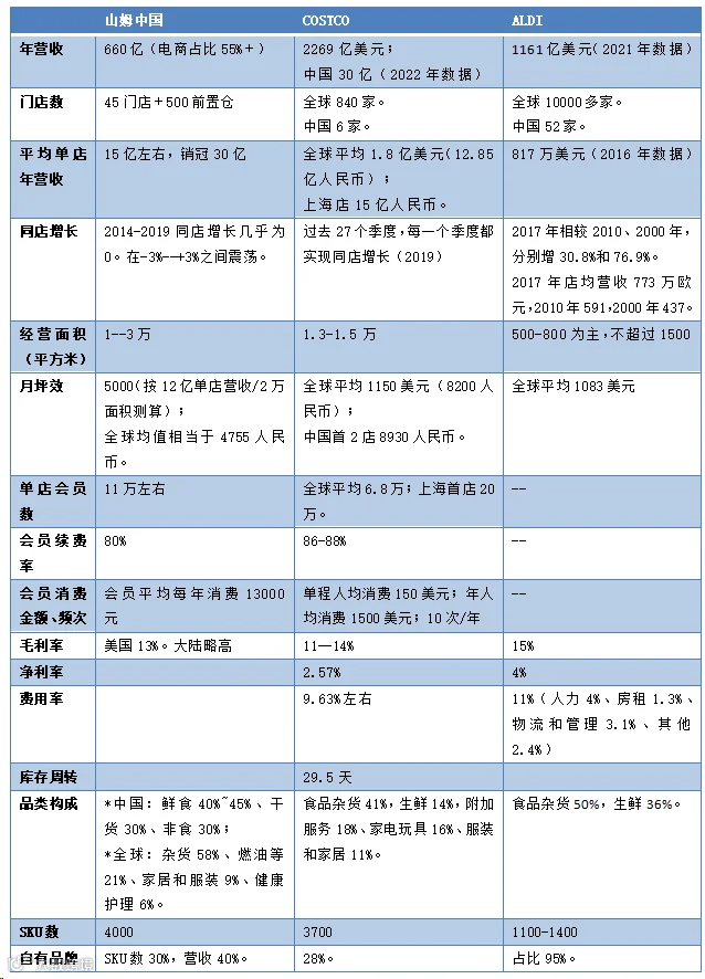 我做过一张图,大致比较COSTCO、山姆中国和ALDI的经营数据。