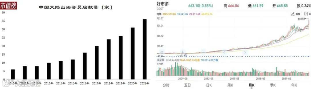 在全球范围内,仓储会员店鼻祖Costco,2023年营收2422亿美元,净利润62.9亿美元,市值突破3000亿美元。最近5年净利润年均增幅15.1%;最近25年,股价从8.5涨至666。涨幅71倍,年化增幅高达19%+。