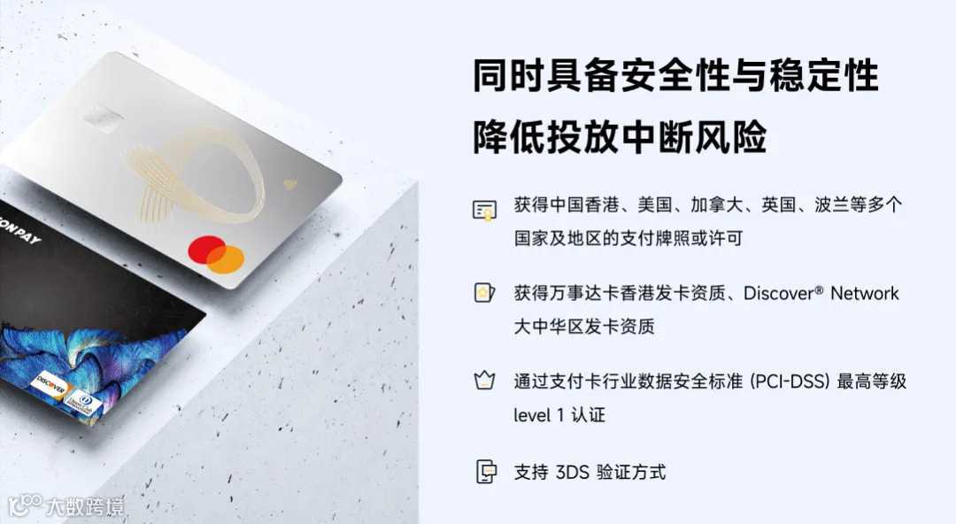 交易安全是所有交易的核心要求,更是广告投放稳定可持续的底层基石。PhotonPay光子易获得万事达卡香港发卡资质、Discover® Network大中华区发卡资质,同时具备安全性与稳定性,降低投放中断风险。通过了支付卡行业数据安全标准(PCI-DSS)最高等级level 1认证,并支持3DS验证方式,为品牌/代理商提供更高等级的信息防护,全方位保障卡片和资金安全,投得省心,花得安心。