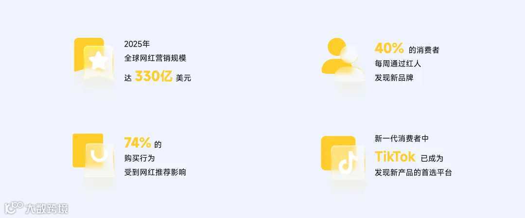 红人营销已成为品牌核心推广渠道。Statista数据显示,2025年全球网红营销规模预计达330亿美元。作为触达Z世代消费者的最佳选择,网络红人的推荐贯穿现代消费者从产品认知、考量到最终购买的完整购物旅程。数据显示,40% 的消费者每周通过红人发现新品牌,74%的购买行为受到网红推荐影响1。尤其在Z世代和千禧一代中,TikTok已成为发现新产品的首选平台2。