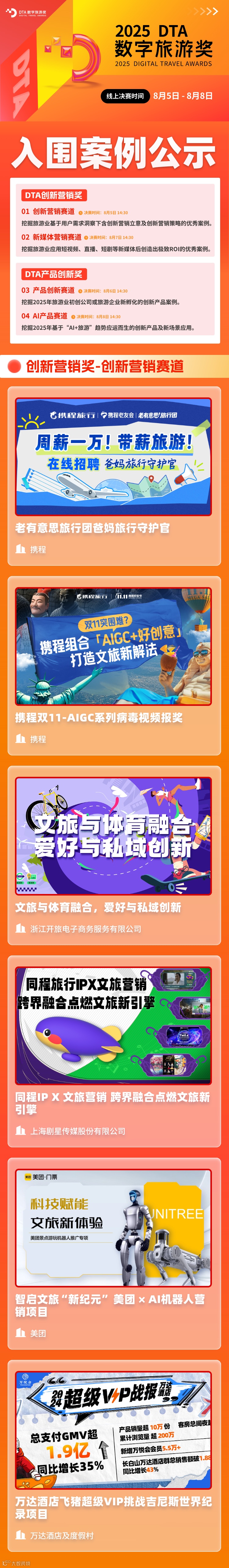 6月17日-7月15日,由酒店、航空公司、目的地、旅游局、邮轮、旅行社的品牌方及旅游科技企业、营销服务商、初创企业等提交的47个创新案例,已进入“2025 DTA数字旅游奖”评委初审阶段[k]。