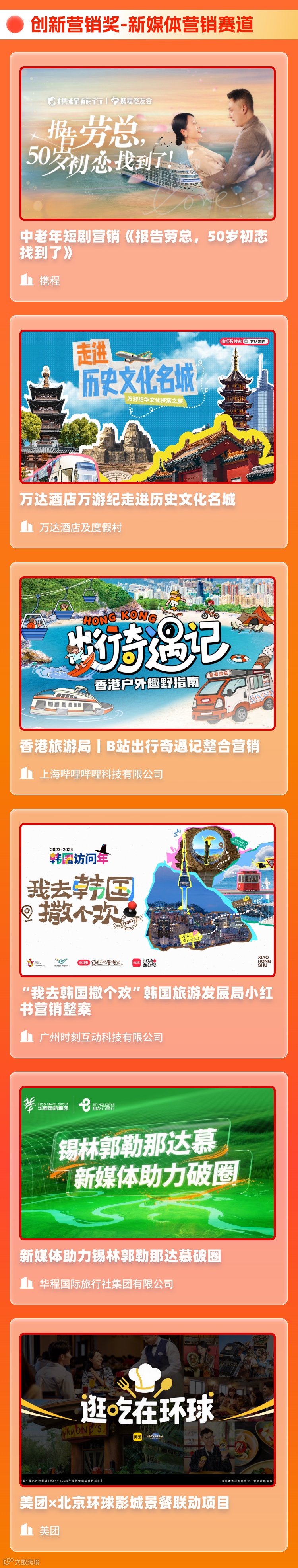 评委代表基于对旅游业趋势的深度洞察和成功经验,从市场前瞻性、用户需求洞察、营销与产品创新性、效果转化与商业价值等维度对案例进行严格评选,每个赛道评选出6个创新案例入围决赛,角逐金奖[k]。