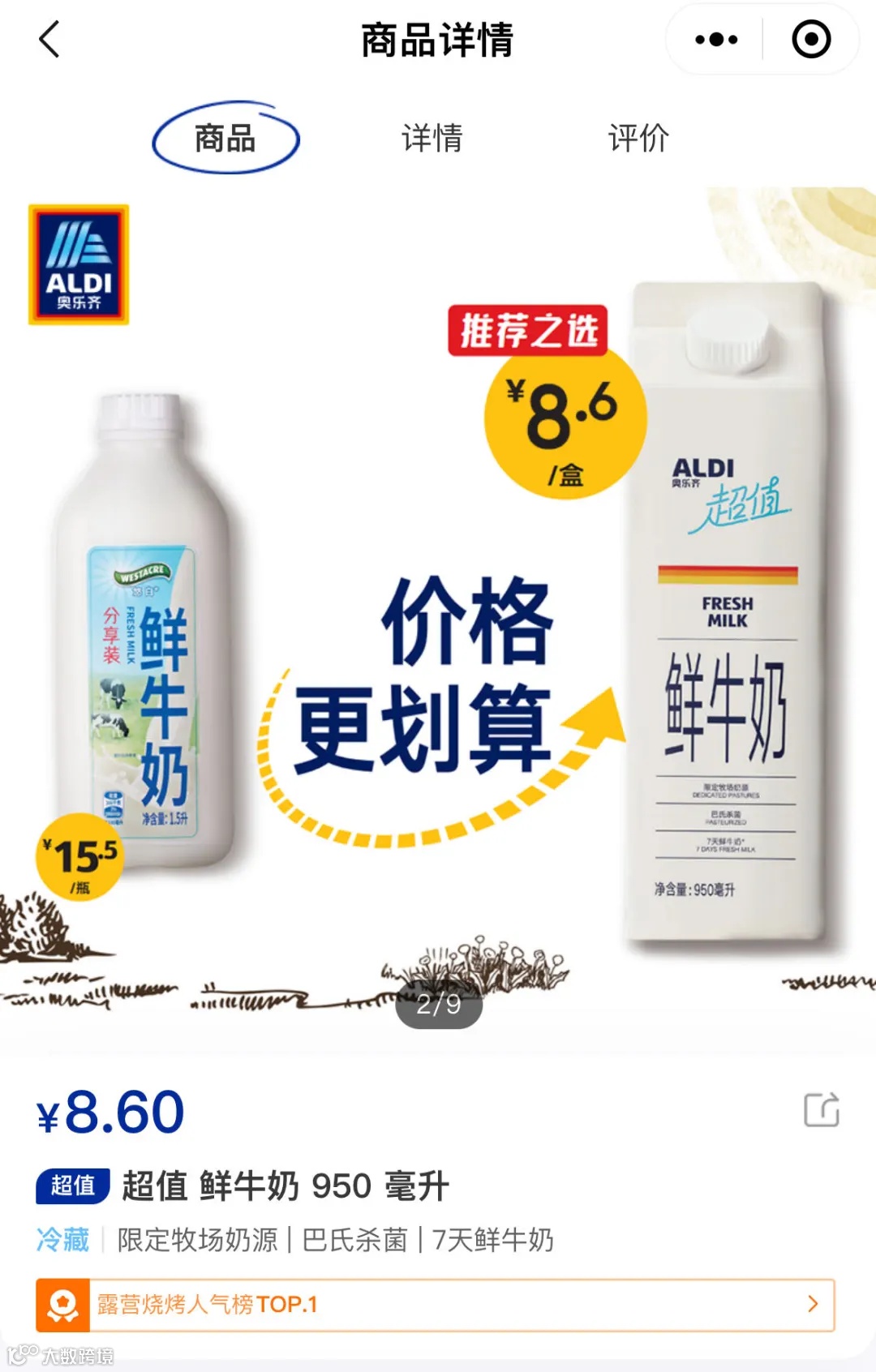 为了适应上海户均2.3人的迷你家庭结构,奥乐齐1.5升的鲜牛奶调整为950ml,8.6元的单价足够便宜,又避免了浪费之虞。