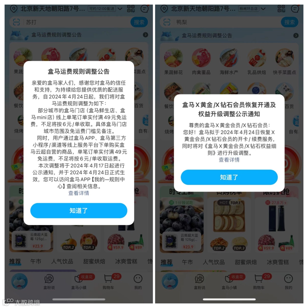 前几天盒马App甚至恢复会员制,还将包邮门槛回调到49元。