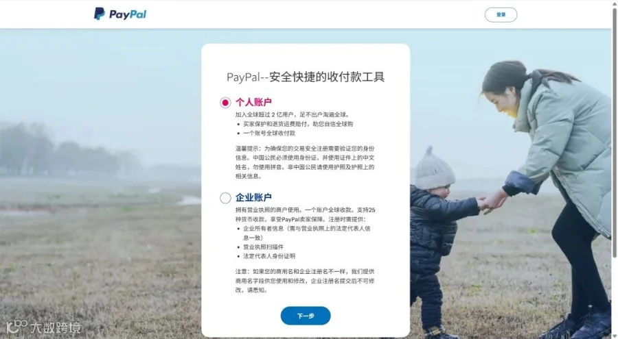 根据需求选择注册个人账户或企业账户。企业账户支持以公司/集团名义运营,允许200名员工有限制地访问账户,并且支持PayPal Checkout等产品。