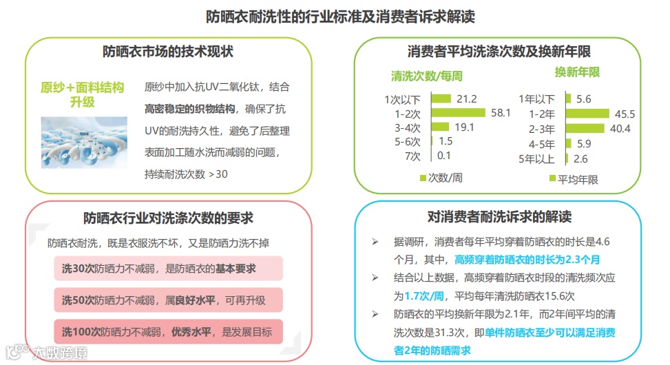 耐洗度对应“耐穿”需求。通过调研,蕉下发现了几个重要的数据:年度高频穿着防晒衣的时长是2.3个月,期间清洗频次是1.7次/周,平均换新年限是2.1年。