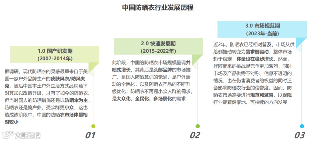 防晒衣从2007年出现在中国,前后经历了三个时期: