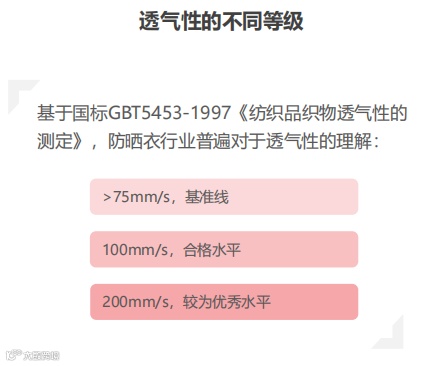 透气率对应的是“不闷汗”需求。但透气和防晒存在一定的矛盾,大白话说,衣服越厚、织法越密,防晒效果一定越好,但这又必然会导致不够舒适。参考国标GBT5453-1997《纺织品织物透气性的测定》,100mm/s为合格水平,200mm/s为较优秀水平,蕉下参考选择了透气率180mm/s作为防晒衣透气性底线数值。