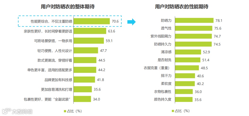 防晒当然依旧是第一位的,除此之外,“性能综合”“亲肤”“多场景穿着”“轻巧便携”“款式潮流”是消费者们对于防晒衣整体期待中排名前五的要素;而就性能而言,一件衣服的防晒力、透气性、紫外线阻隔力、防晒持久度等等,都是消费者所关注的。