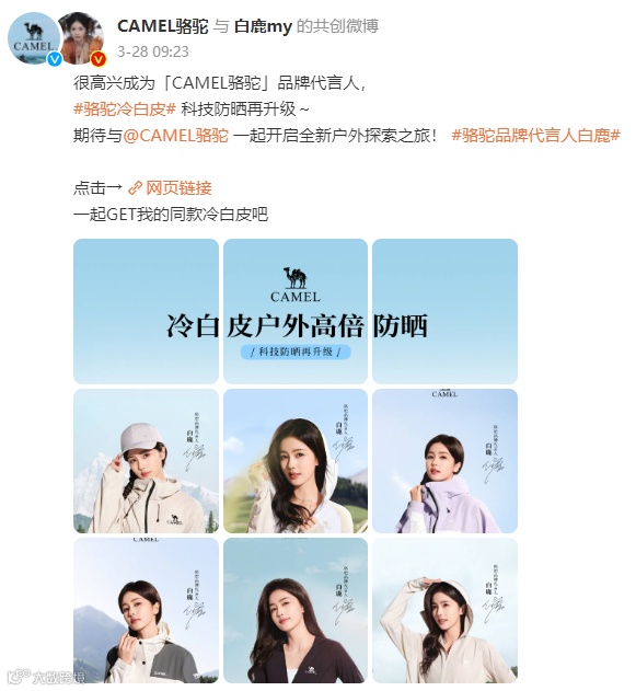 近日,知名户外运动品牌CAMEL骆驼发布全新升级的“冷白皮”系列防晒。同时官宣演员白鹿成为品牌代言人,通过白鹿的阳光形象和对户外探索的热情,诠释出品牌对于专业户外装备的不懈追求。