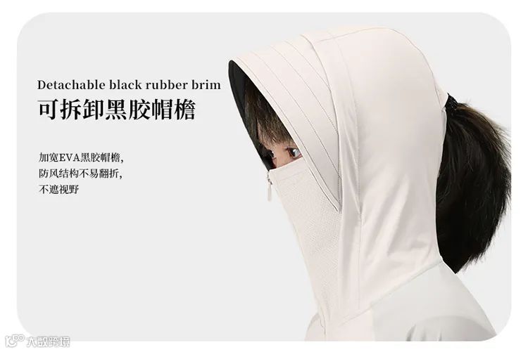 此外,“冷白皮”系列防晒衣还仔细参考了近年消费者在遮阳帽、防晒口罩等硬防晒其他品类上的消费偏好与使用习惯。专门设计了8.8CM可拆卸的加宽EVA防风帽檐,以及防晒至眼角的透气面罩,让消费者能够“从头白到脚”。