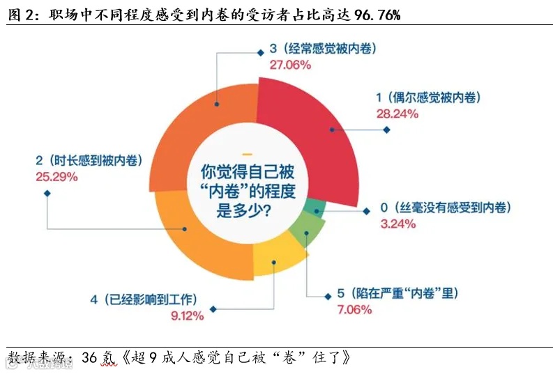 据36氪调查数据,职场中不同程度感受到内卷的受访者比例高达96.76%,其中陷入严重内卷并影响到工作的受访者有16.18%,而完全没有感受到内卷的职场人仅有3.24%。