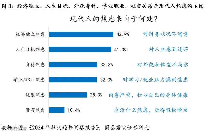 根据《2024年社交趋势洞察报告》,越来越多的人被困在各种各样的烦恼和焦虑之中,经济独立、人生目标、外貌身材、学业职业、社交关系是现代人焦虑的主要因素。