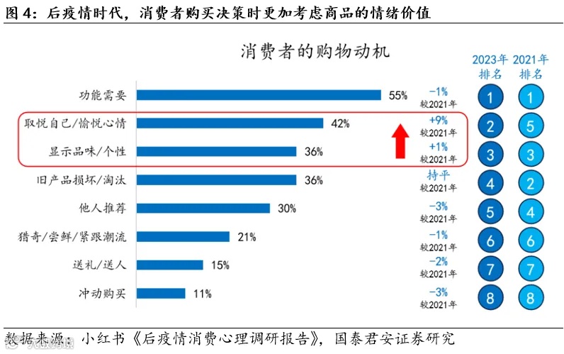 根据小红书《后疫情消费心理调研报告》,消费者的购物动机中,除了基础的功能需要外,取悦自己/愉悦心情、显示品味/个性的重要性在不断提升,购买决策时更加考虑商品的情绪价值。