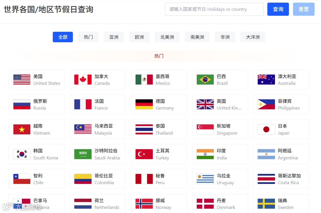 大数跨境网站的节假日查询工具是专为跨境电商卖家设计的,它提供全球主要国家和地区的节假日信息。