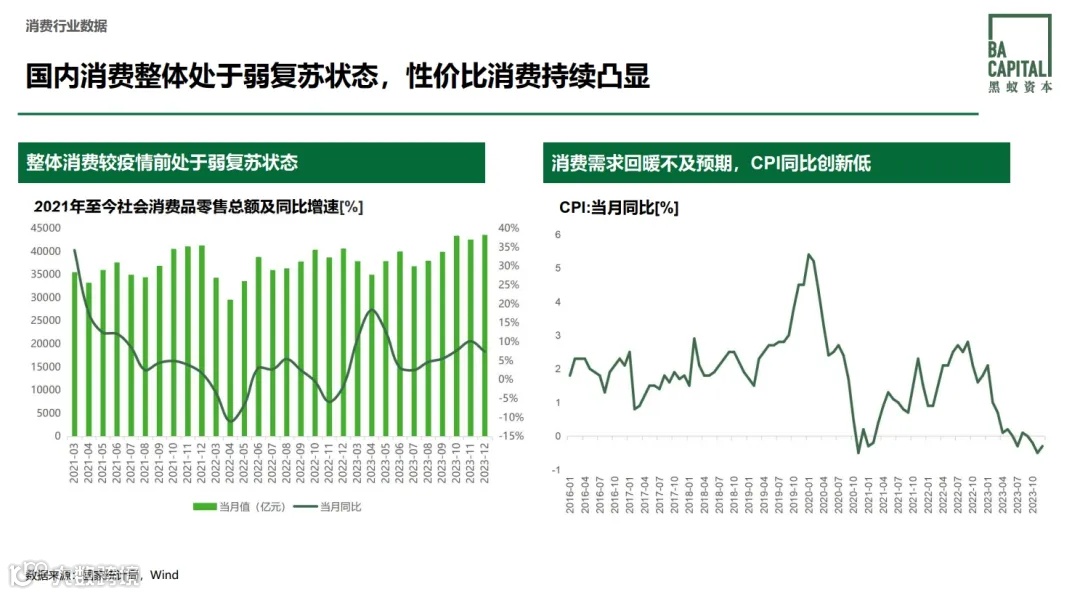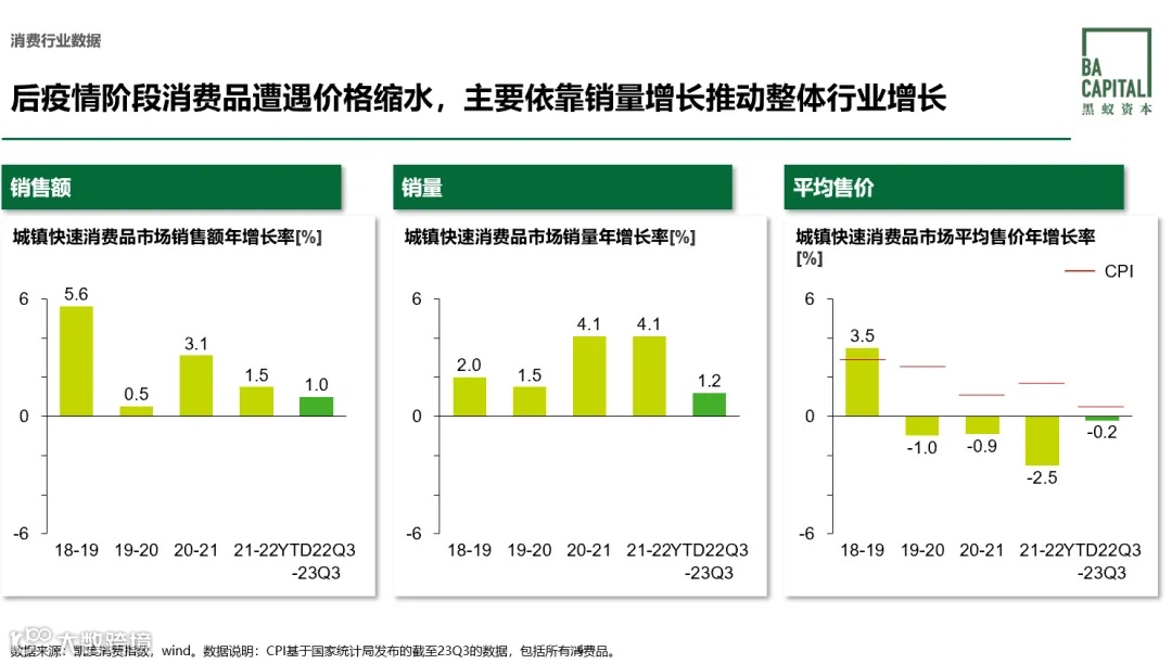 CPI持续走低、售价下调、企业利润空间收窄,说到底是供给过剩与内需不足的结果。消费是后周期的行业,消费的繁荣是经济发展的结果,不能独立于其他产业的发展单论消费的历史进程。